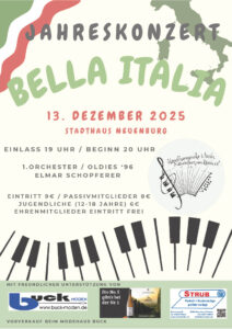 Im italienisch-weihnachtlichen geschmückten Saal werden das 1. Orchester und die Oldies `96 unter der Leitung unseres Dirigenten Elmar Schopferer die Zuhörer mit dem begeistern, was in den letzten Monaten eingeübt wurde. Sicherlich ist für jeden Geschmack etwas dabei.